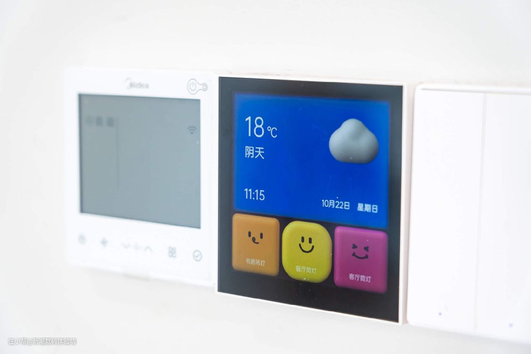 中央空调的线控旁边我安排了一个触控屏妙控开关S1E,有多套主题可以更换,颜值很高。