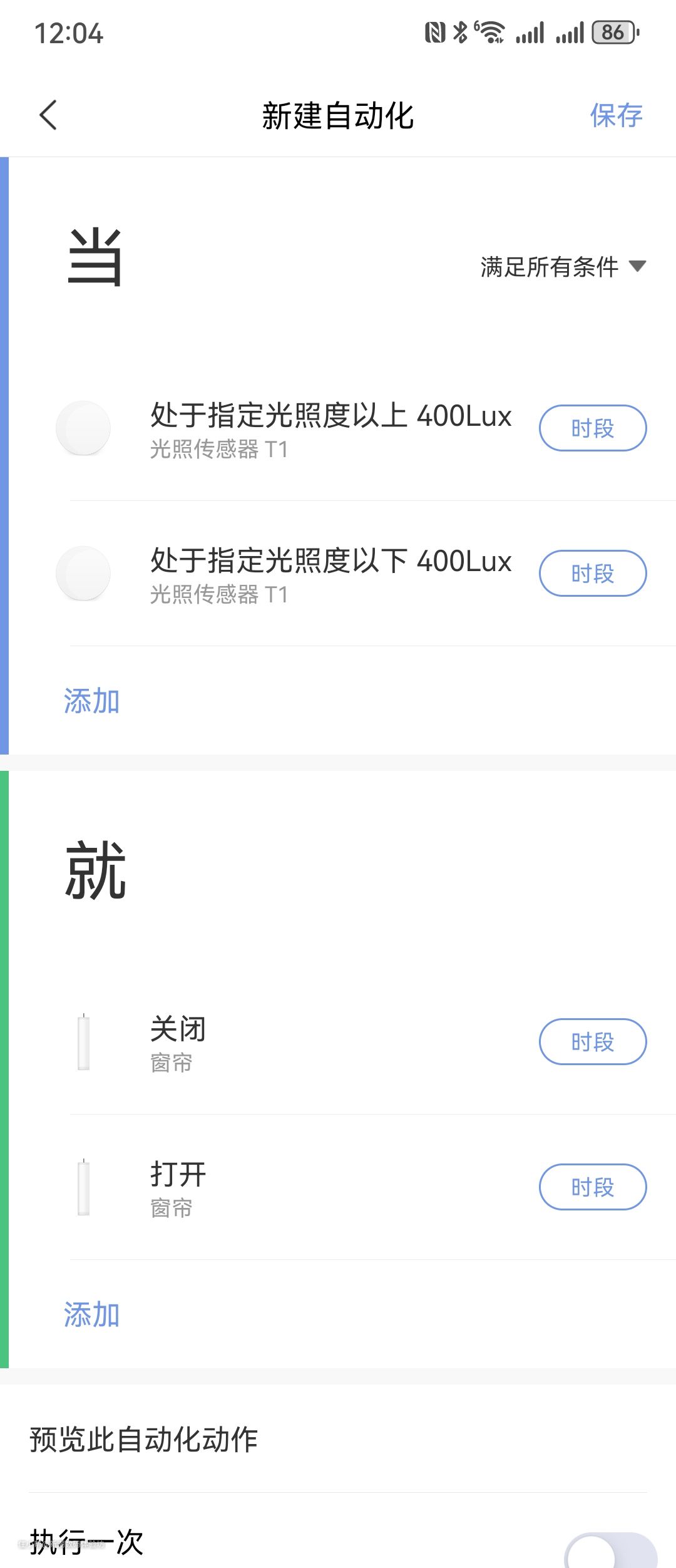 玩法四:大阳台的窗户上我安装了一个Aqara光照传感器,可以在App里设置处于指定光照度以上,就自动打开窗帘,处于指定光照度以下,则自动关闭窗帘。当然如果你没有光照传感器,也可以设置定时自动开合,早上自动开,晚上自动关。