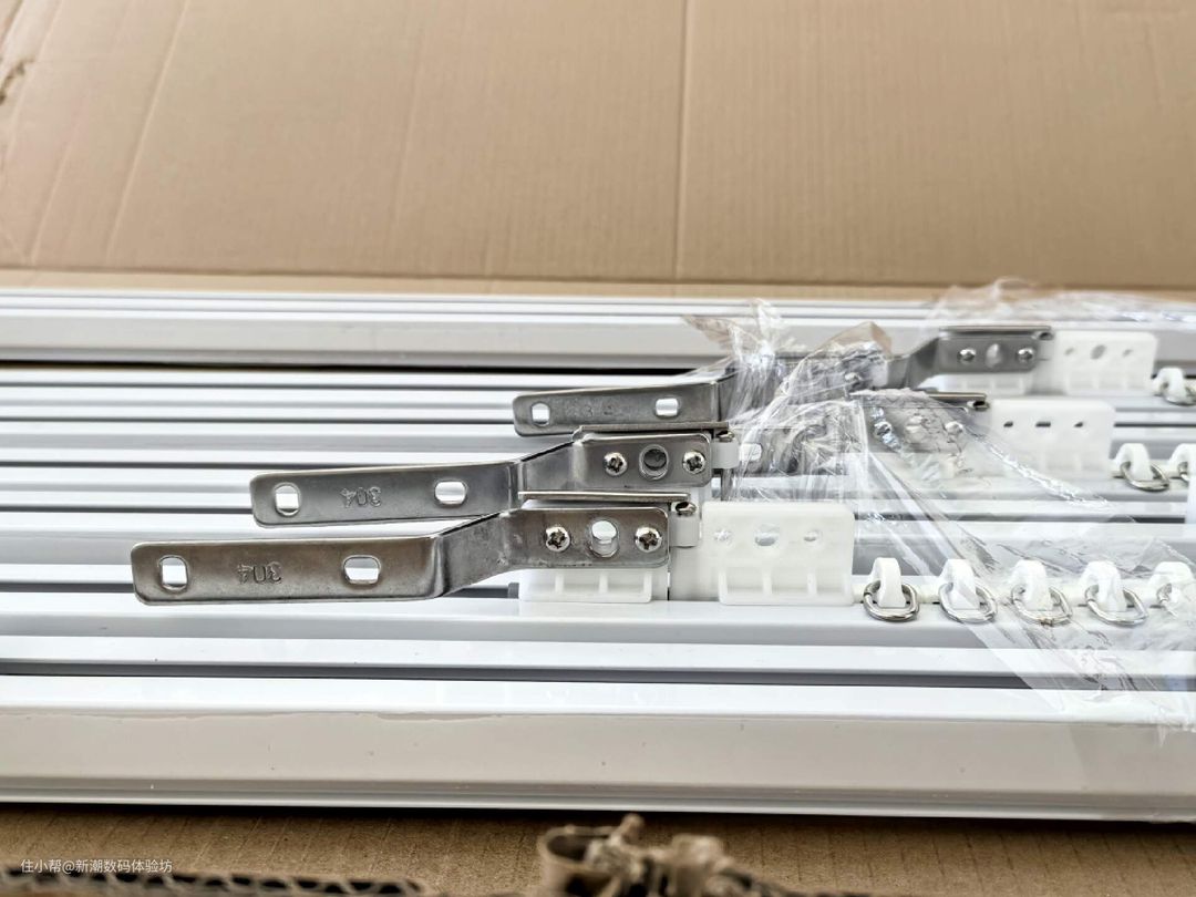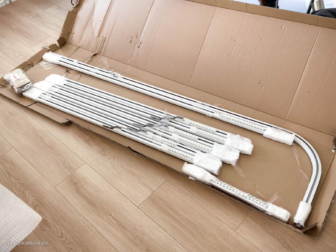 我入手的是含电动导轨的套装,师傅上门测量之后,几天后就收到了顺丰快递寄来的导轨。这次我计划安装大阳台和三个房间的窗帘,共四个电机,全部单轨,大阳台是L型导轨,三个房间是直轨。