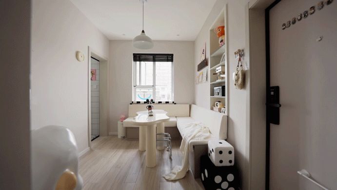 客餐一体的设计缓解了小空间的局促,贴合墙体结构,定制L型卡座,既可作为沙发使用,也能充当餐椅角色。