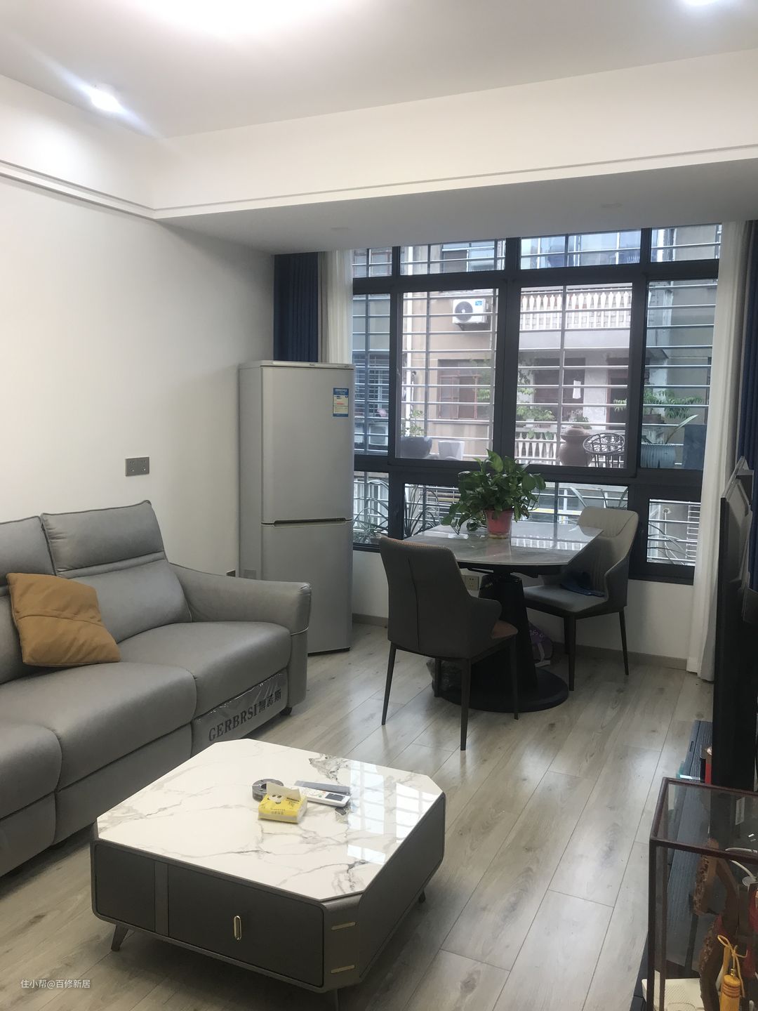 2. 翻新后:装修风格简约时尚,重新粉刷了墙面,铺了地板,换了家具,增加了绿植,营造出温馨舒适的氛围。