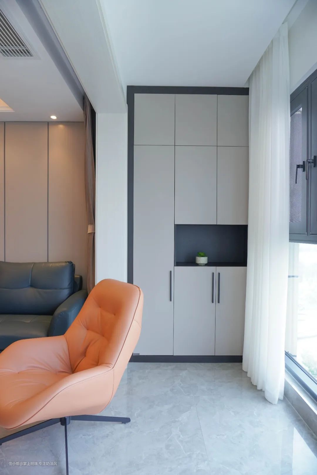 在阳台一侧设计了定制柜,长挂衣区、顶部收纳、H形镂空腰线设计,长短有序、藏露具备,收纳问题无须担心。白色简约柜门,搭配阳台落地白色纱帘,仙气飘飘,家的美貌就藏在这样的小细节里。