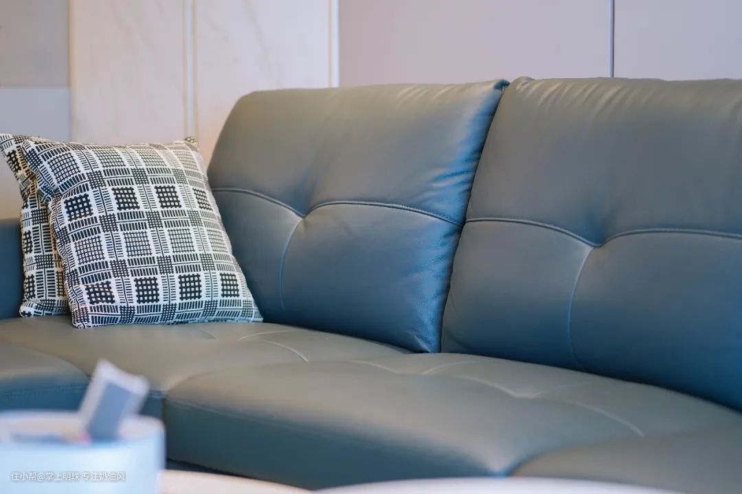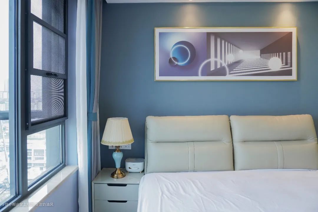 同时利用孔雀蓝色的台灯、深海蓝的墙面,以及沙发和挂画起到提亮空间的作用。