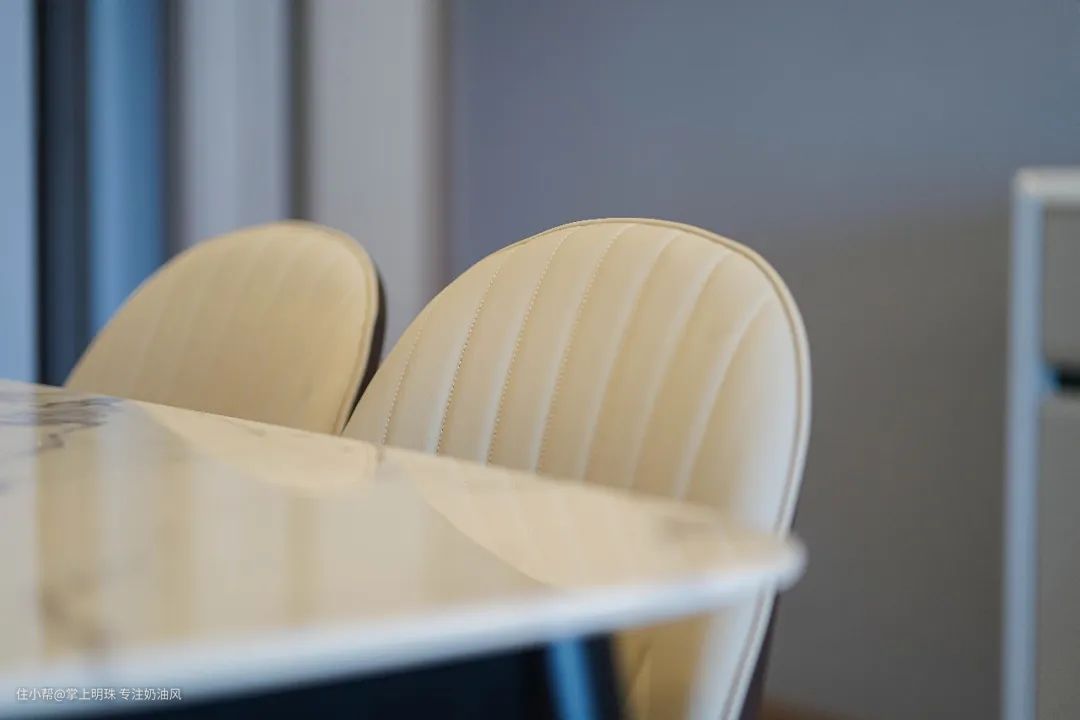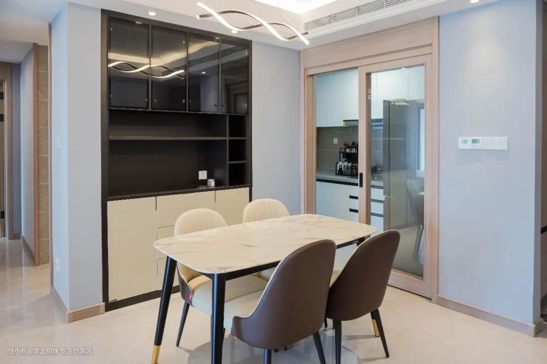 考虑到屋主家平时用餐人数较少,设计师为他们选择了一桌四椅的爵士白岩板餐桌,餐桌一侧是整面墙的定制酒柜。为了契合屋主对简洁风格的喜好,设计师抛弃了复杂的酒格酒架,选择上方黑色玻璃柜门搭配下方暖白色烤漆无把手设计柜门,以简洁的设计、多种收纳形式让酒柜更加实用。