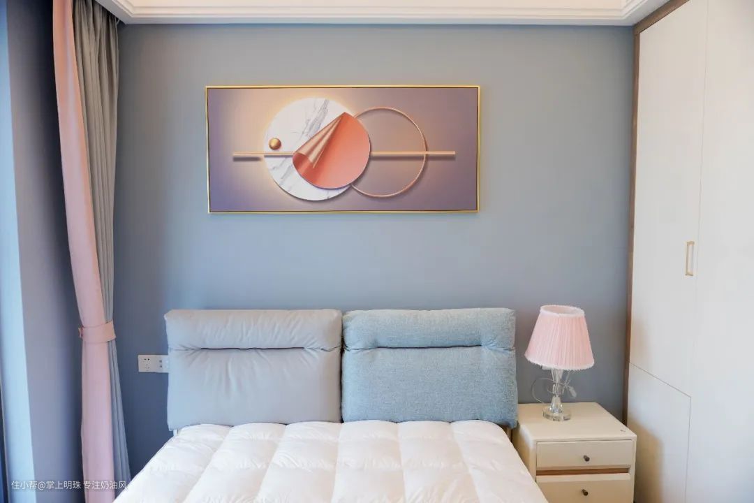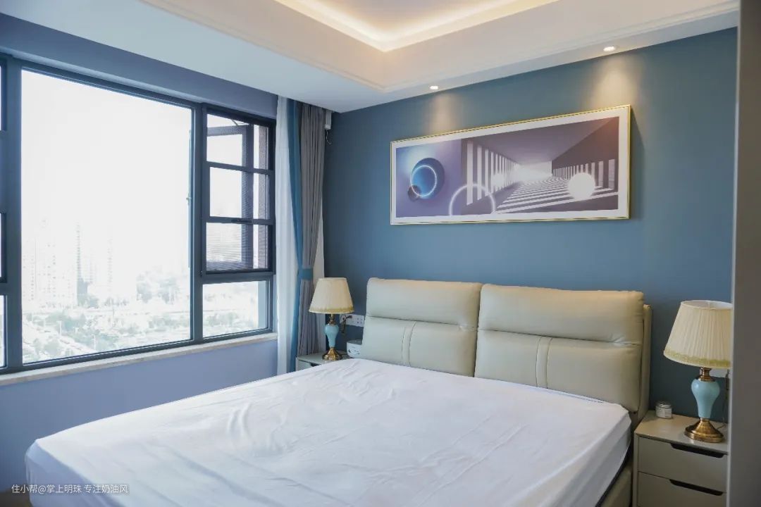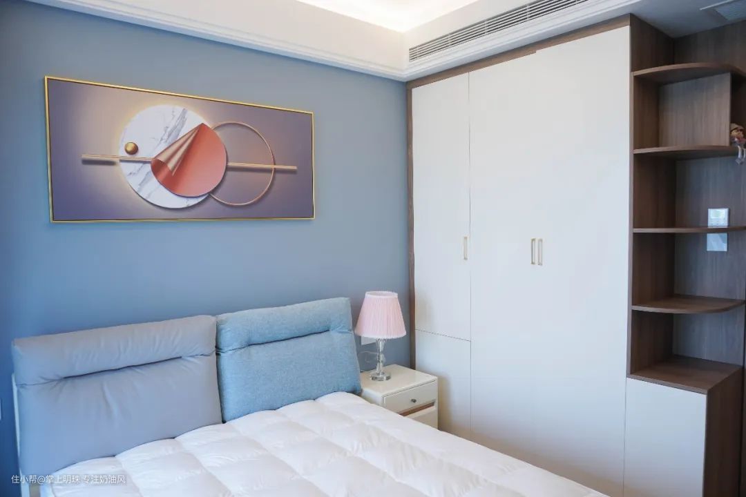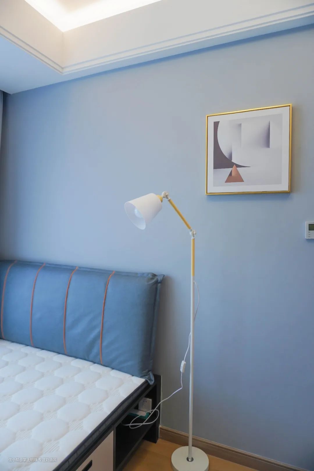 次卧是屋主女儿的房间,考虑到女孩细腻温柔的心思,整体色调偏可爱温暖。墙面是温柔的海蓝色,窗帘选用了灰色+粉色的搭配不会过于幼稚。