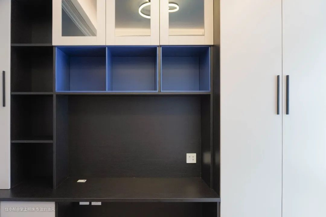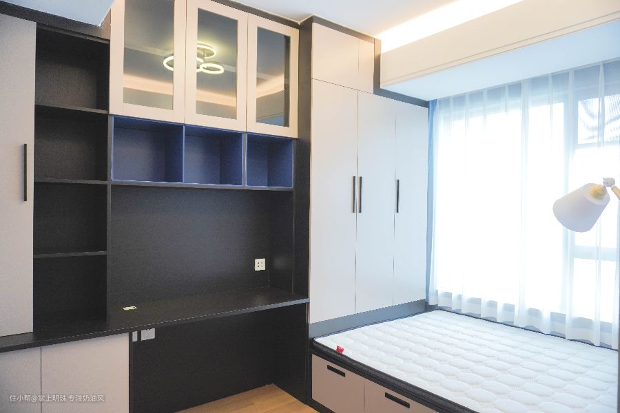 书房还选用了黄色点缀的落地灯、蓝色+金色竖条纹软包床靠、大面积灰色和少量蓝色的撞色窗帘,来柔化了大面积黑白的冷硬感。整体上看,榻榻米房间的气质不仅不会显得“冷”,反而有种精致的舒适感。