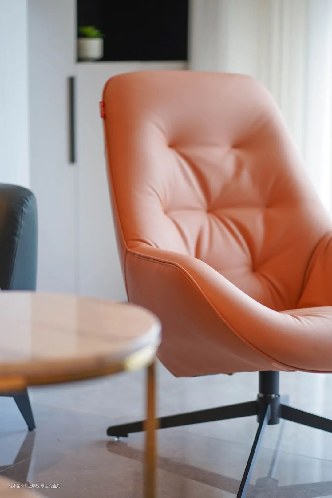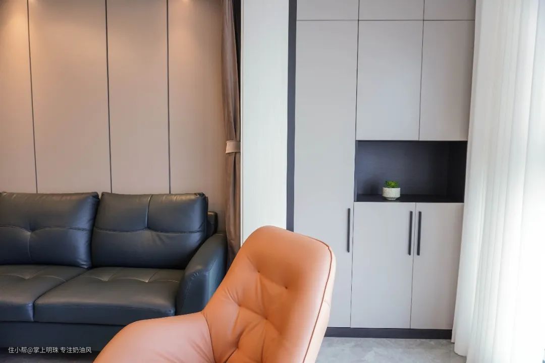 雪山白、暖灰搭配的电视柜,格调藏蓝色的真皮沙发,暖橙色的科技布单椅,搭配金色细窄边框的雪山白岩板电视柜,冷暖色调交相辉映,材质舒适精致,让整个客厅看起来高级又大气。