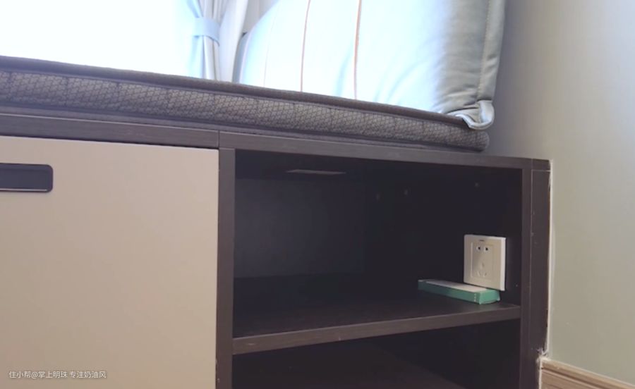 靠近床头位置并未设计为抽屉,而是设计成了上下两层的镂空开放格,安装插座,临睡前看的读本、手机都有了地方安置。