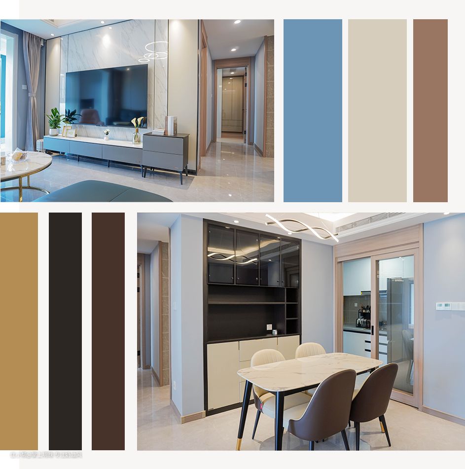 本案整体家居色彩偏冷色调,蓝色系、白色系、黑色系为主要色调,辅以灰色、金色、浅粉色等进行点缀调和,柔化空间。