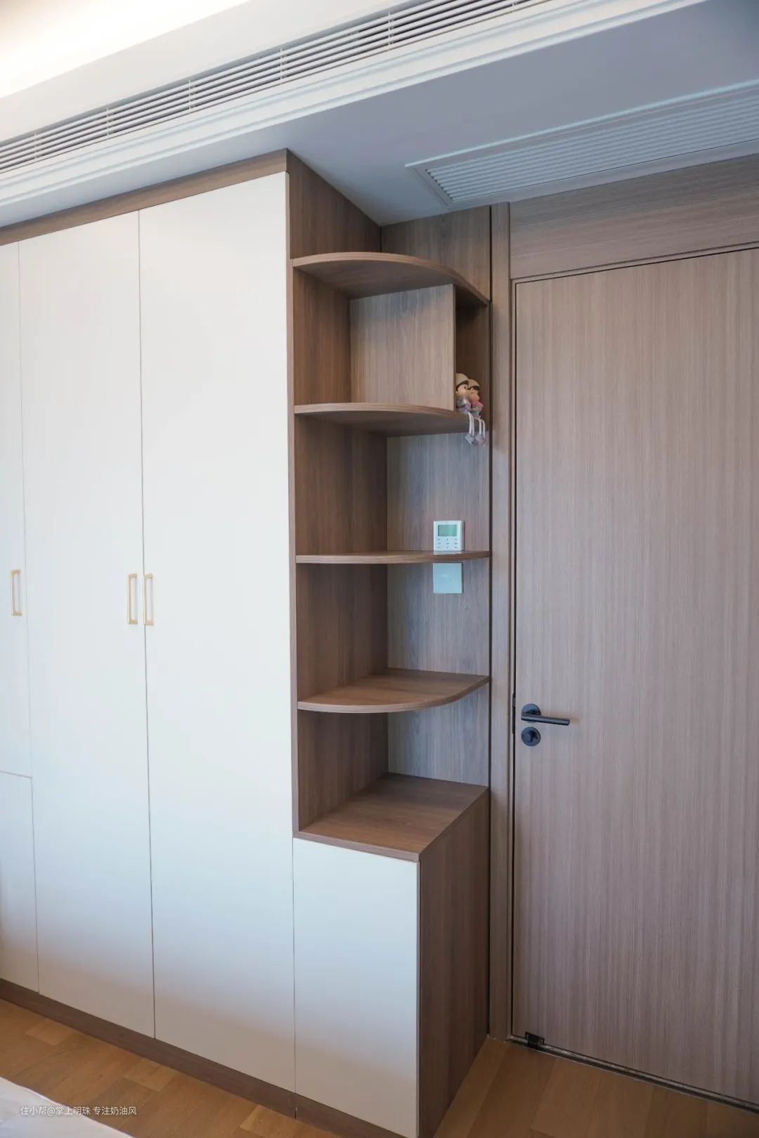 进门处设计为上方圆弧形开放格、下方柜子的形式,是为了不挡住上方空调出风口,同时也能方便收纳主卧的小物件。
