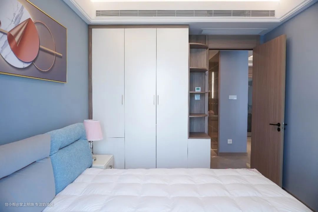 主卧是一个比较长的空间,所以用衣柜区分为了两个空间。进门一侧是衣帽间,衣柜另一侧则是睡眠区,做到了卧室里的“动静分区”。