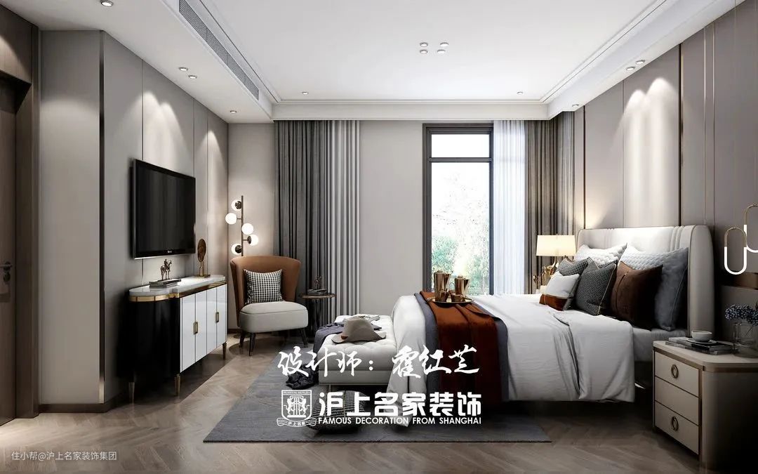 卧室的面积较为宽敞,还在靠窗位置摆了一个休闲区,在无主灯的空间下,布置现代舒适的软装家具,营造出一种惬意从容的居住体验。