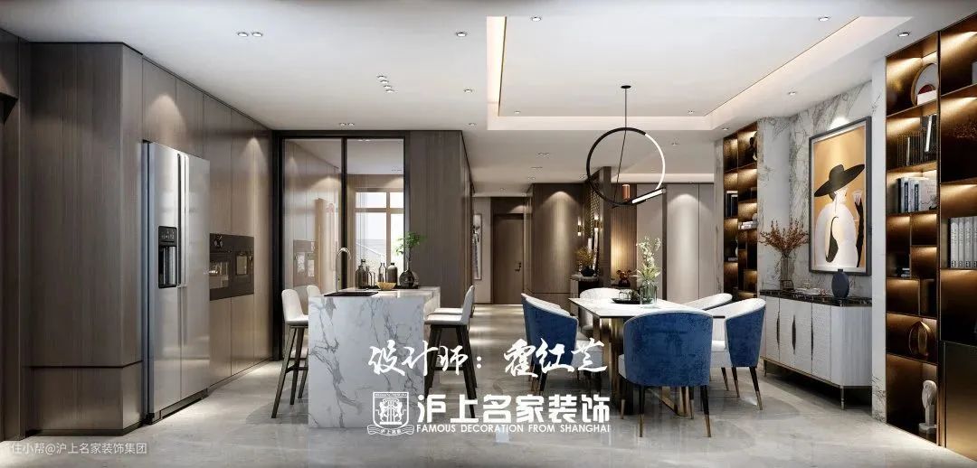 餐厅与客厅连成一体的大空间,中间的展示柜摆上精致的摆饰品,再以暗藏灯带的装饰,也让空间显得更加优雅高级。
