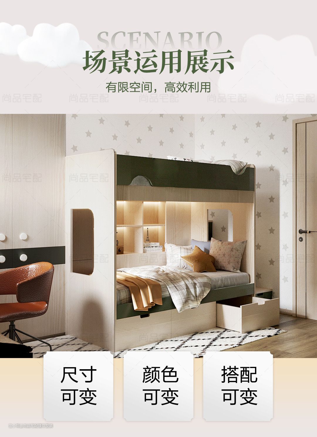 小朋友的成长速度很快,因此并不需要为现阶段特别设计,以免长大后无法延续使用。建议可在衣柜内多设计一些活动式抽屉,可依小孩子衣物收纳的需求灵活调整,并应对日后使用需求的改变。