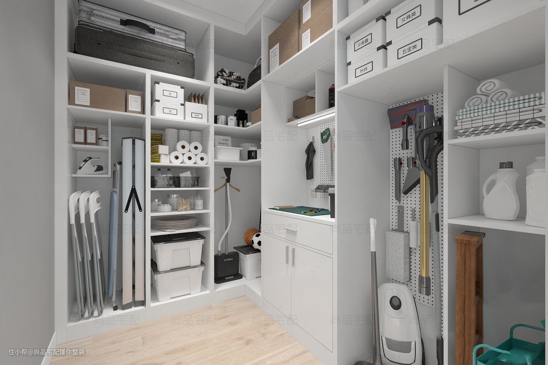 放进储藏室的物品当然也要做好分类,因为已经有面板,并不需要再多做柜子,可利用能调节高度的活动层板设计,视物品尺寸调整高度、分层收纳,常用的放在中间层,较少使用的放在上层,除湿机、吸尘器等家电则放在最下方,方便拿取使用。