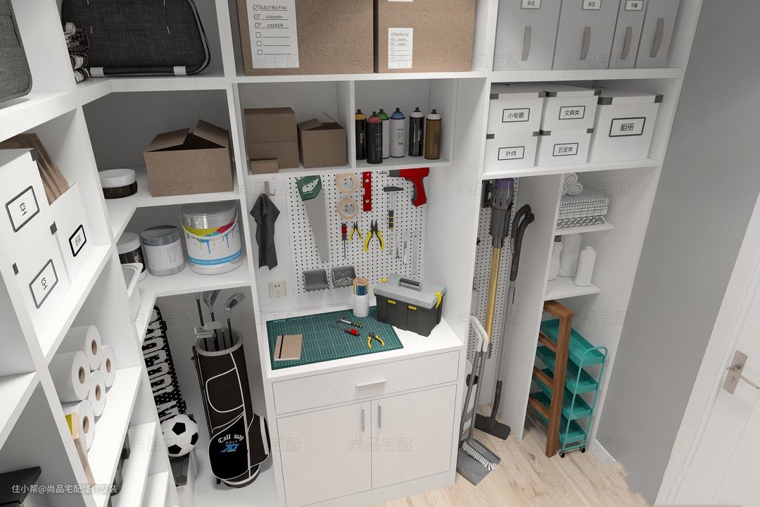 Q:放进储藏室的物品怎样才不会乱到拿不出来?平常会用到的螺丝刀、扳手之类的家居修缮工具,也可以收纳在这里吗?还有其他乱七八糟的杂物,又该如何规划收纳空间呢?