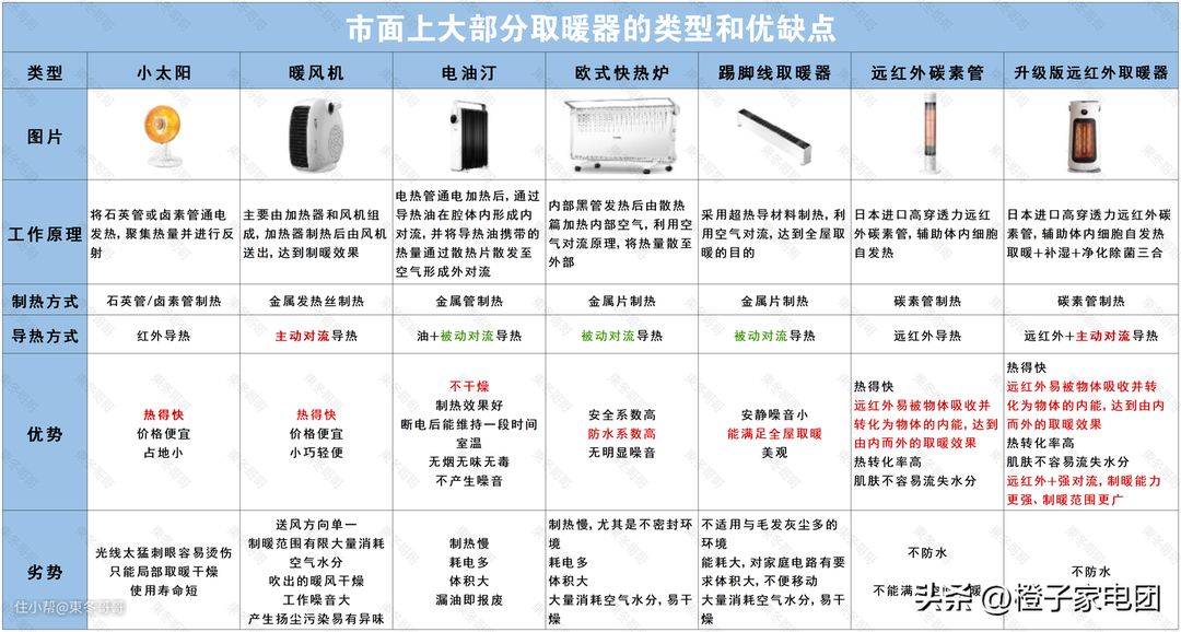 市面上大部分取暖器的类型和优缺点