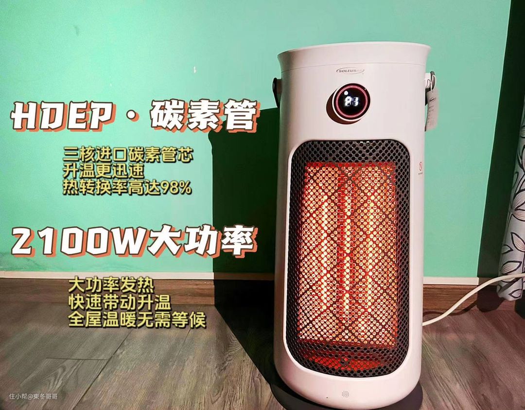 1 秒速热 :采用HDPE碳素管*3发出适合人体吸收的红外光波,搭配铝合金储蓄热量低噪热风机进行暖气输出,输出距离长达3米,60°摇头范围,取暖面积>30㎡。温暖由内而外,打开的瞬间就像是被太阳包裹,暖洋洋的。