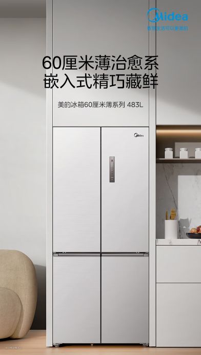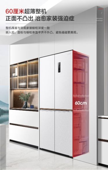- 这款冰箱60cm超薄机身,0.5cm微缝嵌入,机身与橱柜严丝合缝,融入家居,浑然一体;