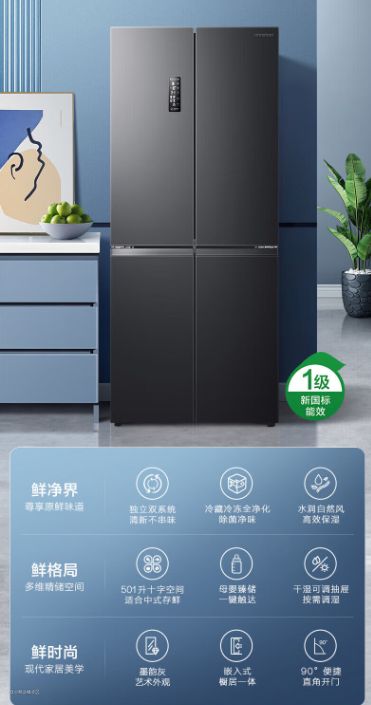 商品名称:容声BCD-501WD18FP 商品产地:中国大陆 能效等级:一级能效 变频/定频:变频 门款式:十字对开门 面板材质:PCM彩涂板 制冷方式:风冷 主色系:黑色系 控温方式:电脑控温 产品尺寸:深694mm;宽794mm;高1900mm 冷藏室容积:296L 冷冻室容积:174L 变温室容积:31L 总容积:501升 制冷循环:双循环