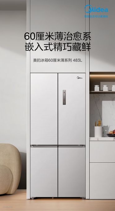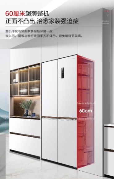 - 这款冰箱60cm超薄机身,0.5cm微缝嵌入,机身与橱柜严丝合缝,融入家居,浑然一体;
