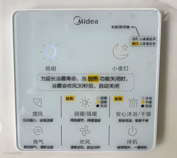 温馨分享:摆风功能可以跟这次分享的任何一种其他功能搭配使用,如果你买了这款浴霸回去,别忘了是可以这么使用的哈。