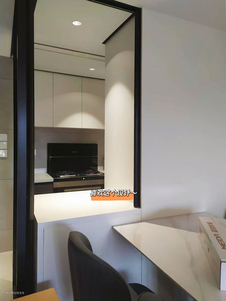 餐厨空间做了隔断设计,中间的隔断窗抽拉式的窗帘可以阻隔厨房、餐厅两个空间,但收起窗帘的时候又可以连接彼此。