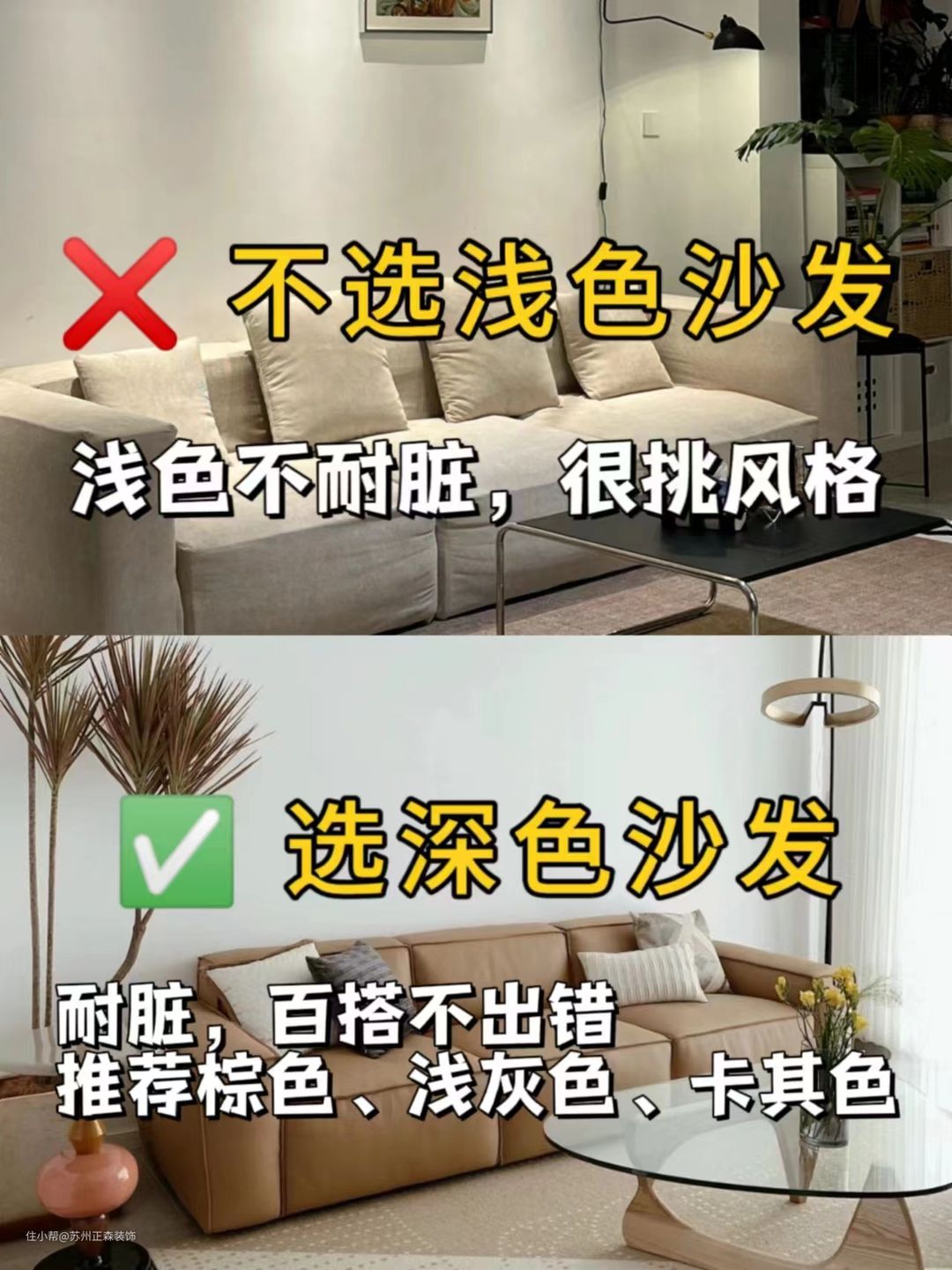 第六,家具的颜色搭配,这个范围非常宽,我们先讲沙发,沙发是一个家的眼,选对沙发家具搭配成功一半。颜色建议是选深不选浅,浅色不耐脏,推荐几个比较百搭的颜色,比如棕橙色、浅灰色和卡其色。