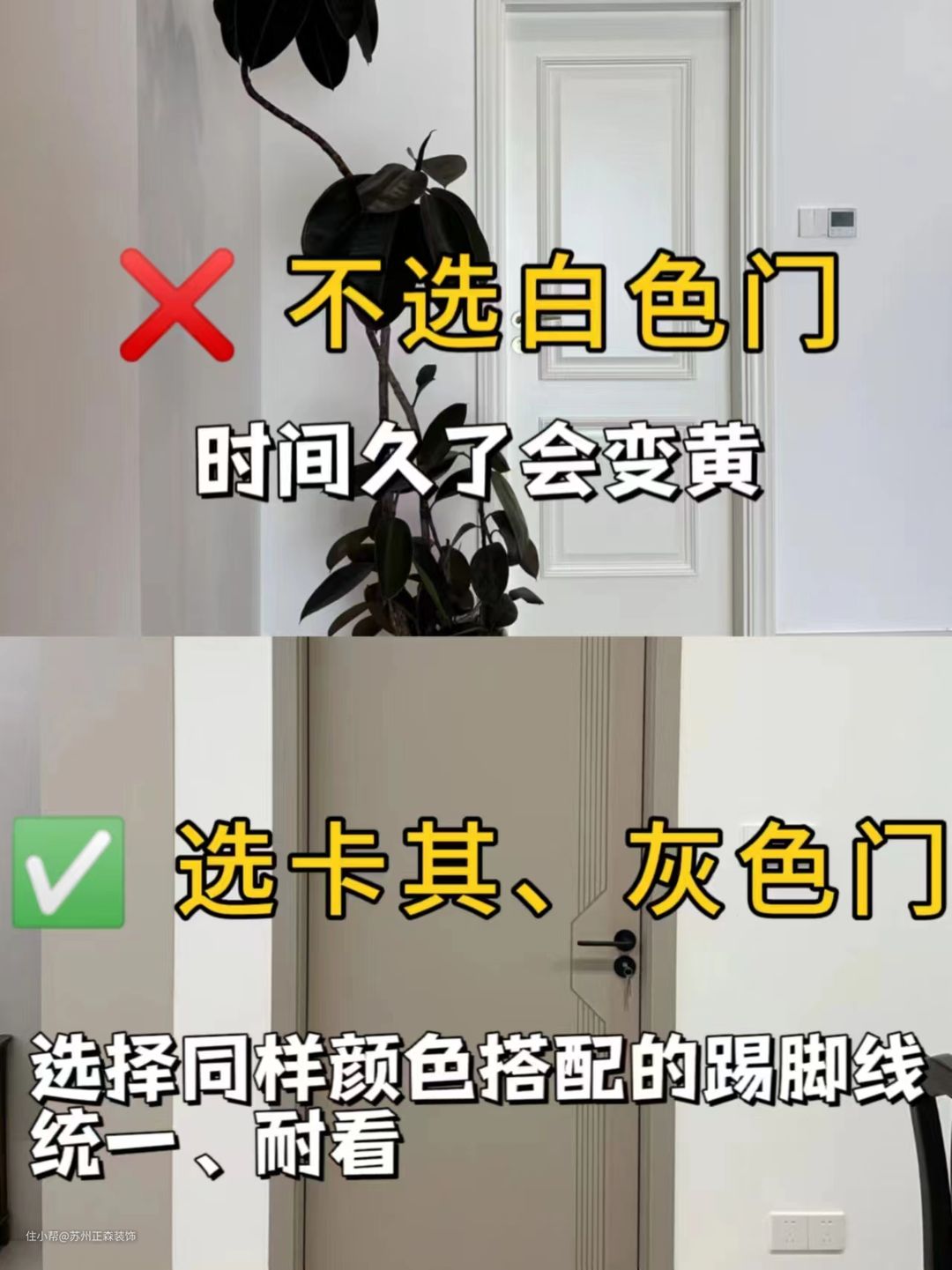 第四,门的颜色,室内门不推荐白色,因为时间久了它会变黄,这个是你无法抗拒的自然现象,建议选这种卡其灰、深石灰的颜色,再把踢脚线也做相同的颜色搭配,越统一越耐看。卫生间的金属门和厨房的推拉门不建议选黑色边框,黑色其实是最不耐脏的,有水渍也很难清洁,推荐选这种月光灰的边框,再加上灰色的钢化玻璃,若隐若现,不打美观,卫生好搭理才是重中之重啊。