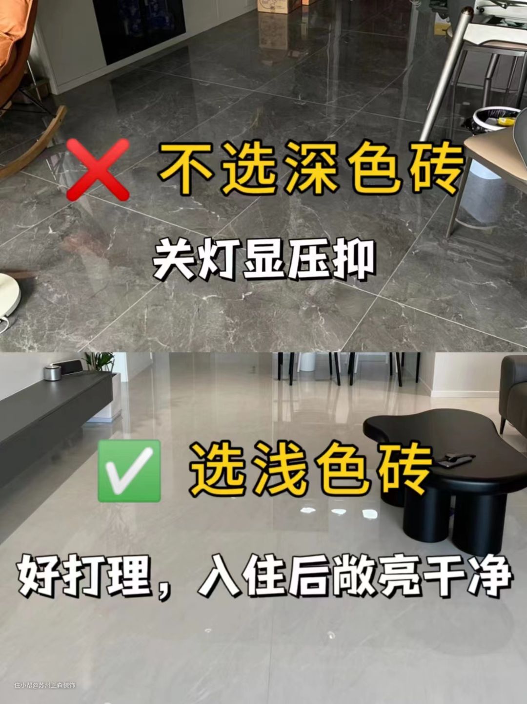 第一,瓷砖的颜色搭配,两个字,素亮,不选深,不选乱。像这种深色的瓷砖,带有大花纹的,等你装好入住,白天只要关上灯,屋子里面难免会有一种阴森森的渗得慌,感觉很压抑。要选浅色调的亮色瓷砖,亮光砖好打理,这是公认的,入住后敞亮干净比啥都强,所以强烈建议选浅灰色、暖灰色、素色的亮美瓷砖。