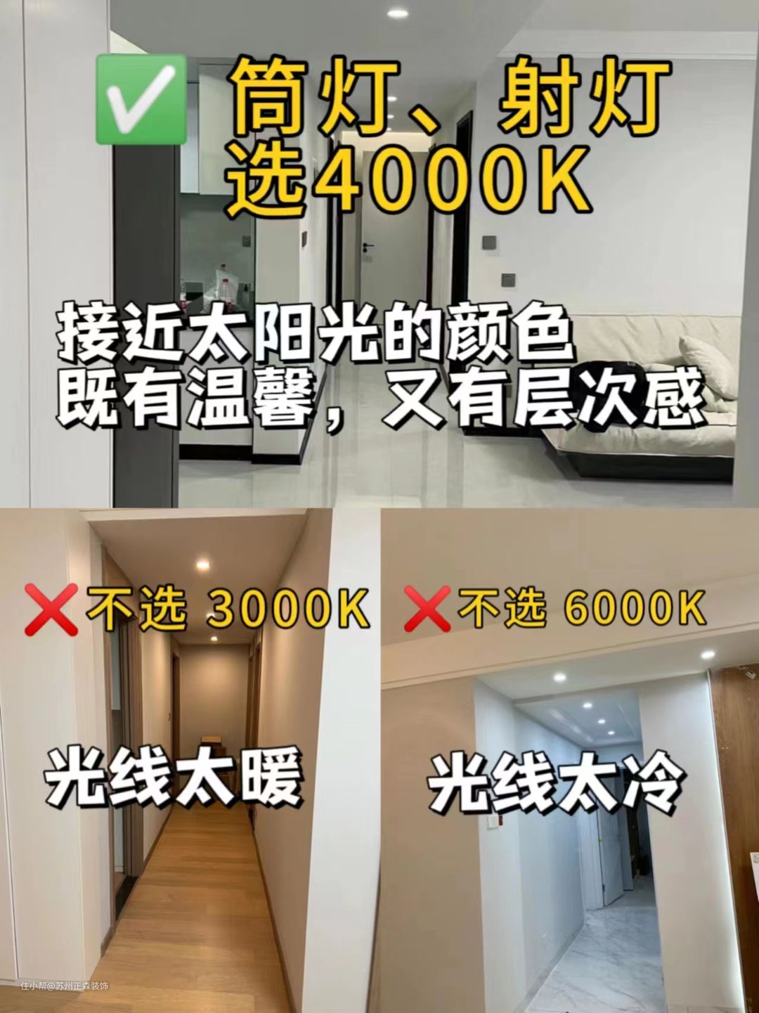 第七,最后一个重点,作为点缀的灯光,全屋的灯光,特别是射灯、筒灯,不懂的就必眼选4000K的,3000K太暖,6000K太冷,4000K的会更接近太阳光的颜色,既有温馨感,又能突出和点缀。层次感有了,高级感也就跟着来了。