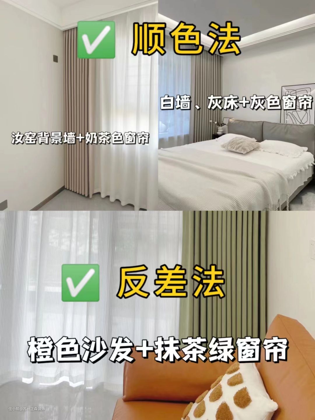 第五,窗帘的颜色搭配。两个技巧,顺色法做反差,顺墙面的颜色,顺家具的颜色。比如卧室的白墙,床是灰色,可以搭配灰色窗帘,如果你是刷了汝窑的背景墙,就可以搭配奶茶色窗帘坐板擦,比如客厅里面的中橙色沙发,就可以搭配抹茶绿的窗帘,整个家洋溢着清新的气息,还带有一丝复古的feel。