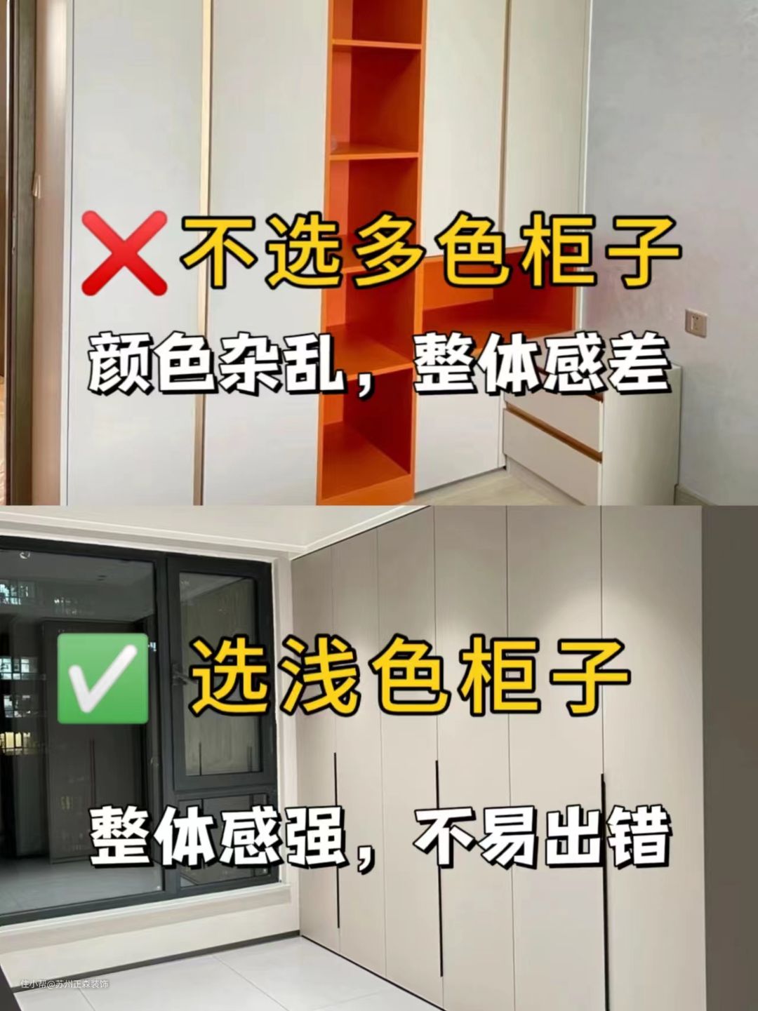 第三,柜子的颜色,首先是不要超过三种颜色,不要做饱和度过高的颜色。拼色首选哑光浅色做柜门柜体可以选择深色,实在纠结柜体柜门颜色搭配的就做涂色搭配,像暖白、打漆灰都是可以又既做柜体又做柜门的颜色。