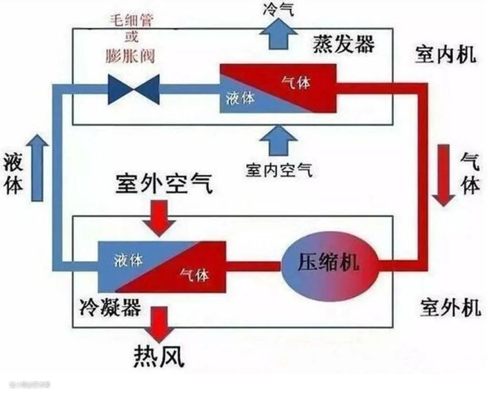 节流装置:将高压液体变成低温低压液体,常见的有毛细管和膨胀阀,制冷剂压力越低,沸点越低,节流装置的作用就是将制冷剂的压力降低到制冷剂对应的沸点比制冷时室内温度(需要从室内吸热),制热时的室外温度低(需要从室外吸热),保证制冷剂能从空气吸热,正常蒸发。