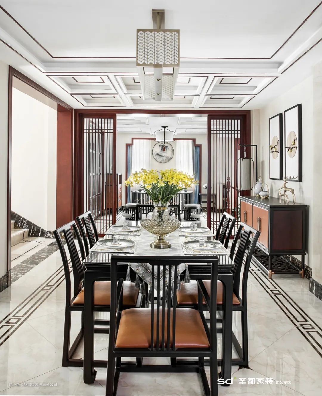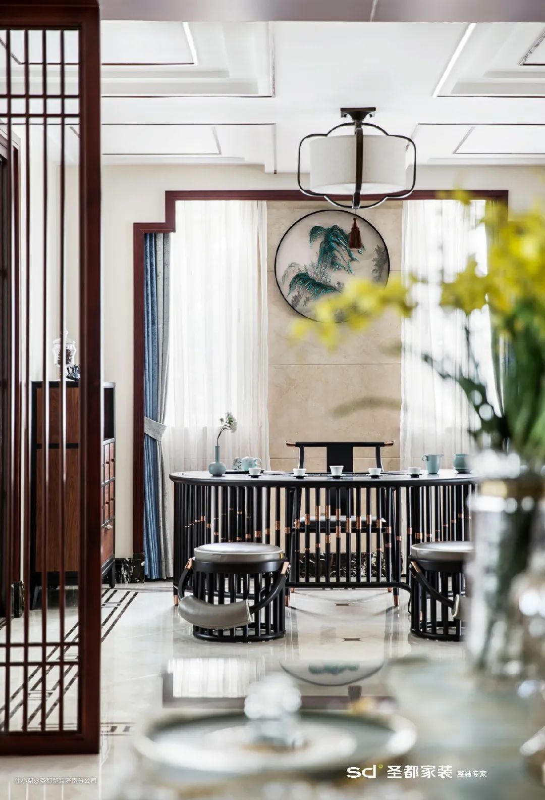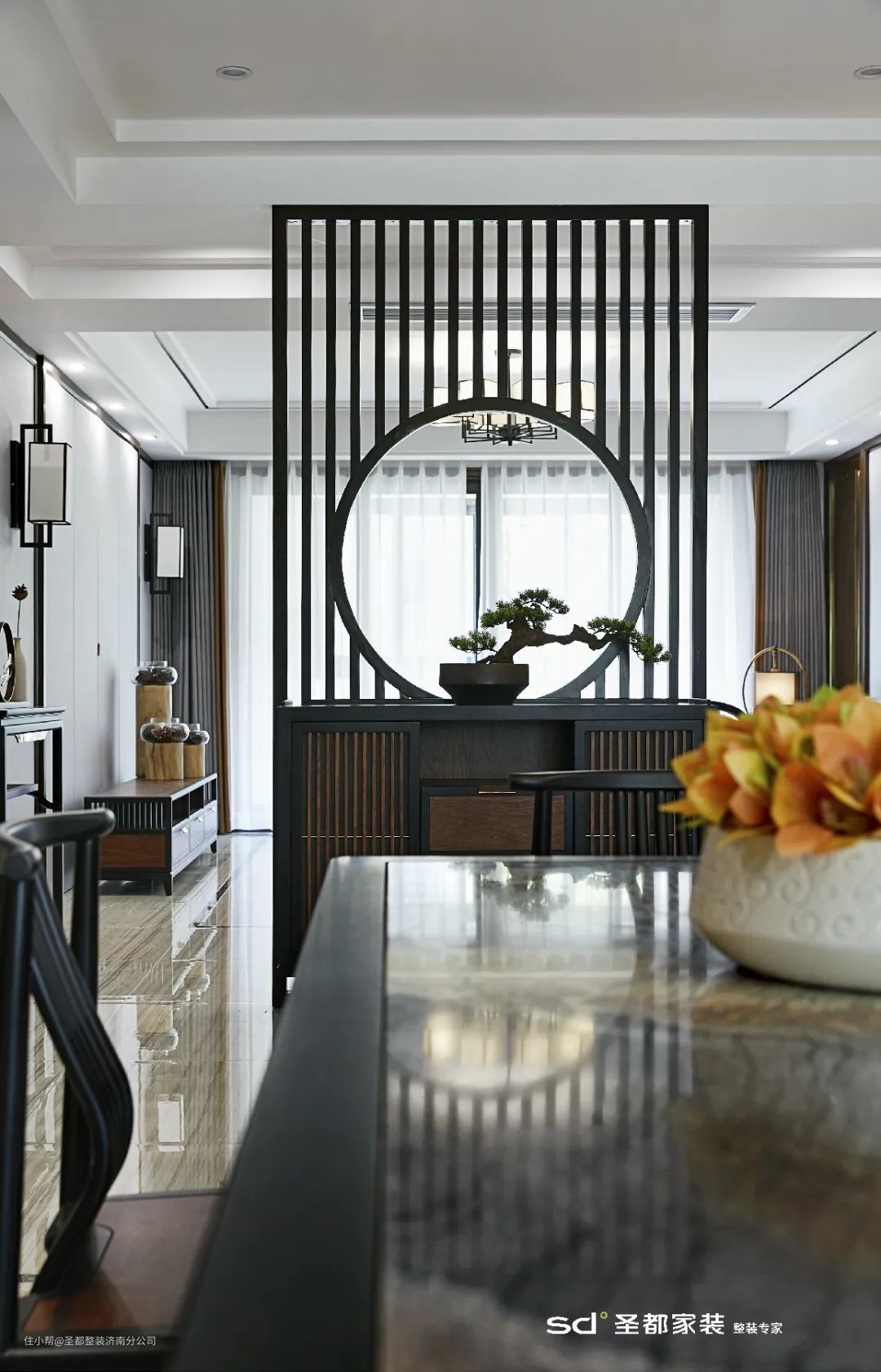 新中式的空间布局,遵循中国的“天圆地方”的思想,讲究对称设计。这种独特的平衡美,让空间比例达到完美形式,以此呈现出庄重、大气的空间氛围感。设计参考↓↓↓