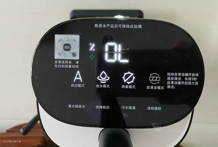 搭配LED数码管显示屏幕,能清晰看到扫地机的电量情况和四大功能模式。另外洗地机出现污水箱满、滚刷毛发缠绕等问题也会在上面提示,非常直观。