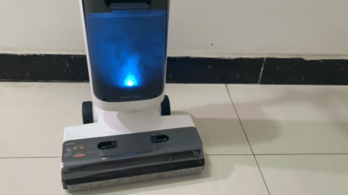 操作很简单,先打开洗地机手柄上的自清洁模式,然后清水箱会电解杀菌水,然后开始自清洁。自清洁时滚刷会自动开启高速旋转,清洁完后再用50°热风自动烘干。