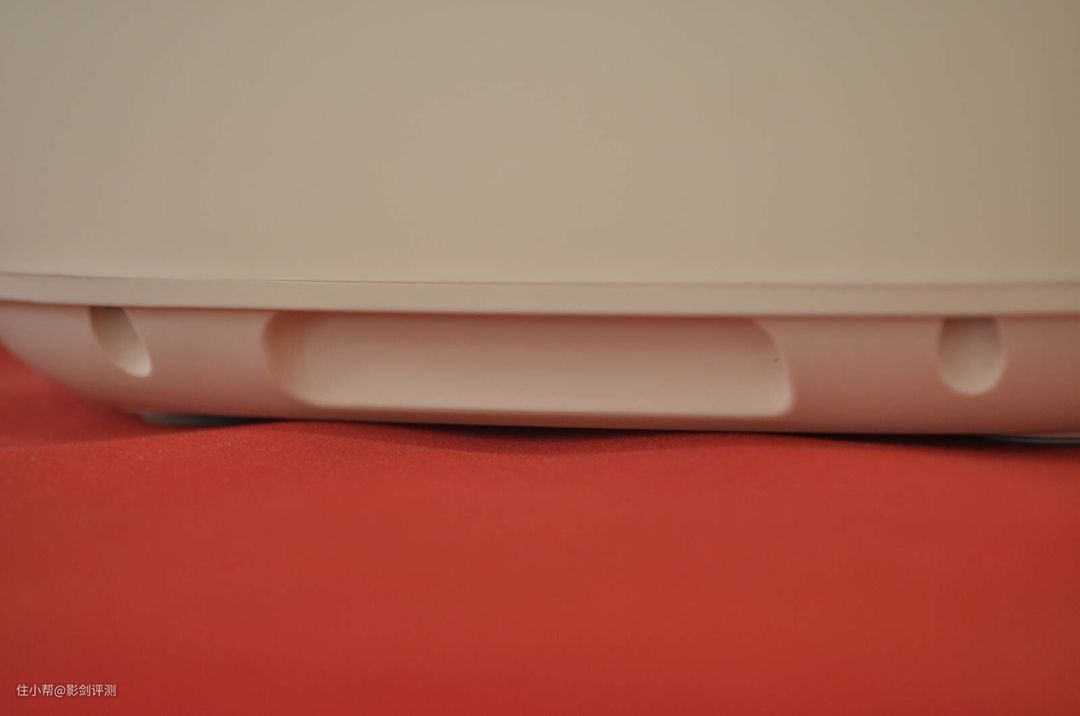 机器的底部有四个硅胶脚垫,可以确保洗衣机稳定,不会在工作的时候抖动或者位移。底部的两侧也有凹槽,这个是手托的位置,搬运时候手的着力点。