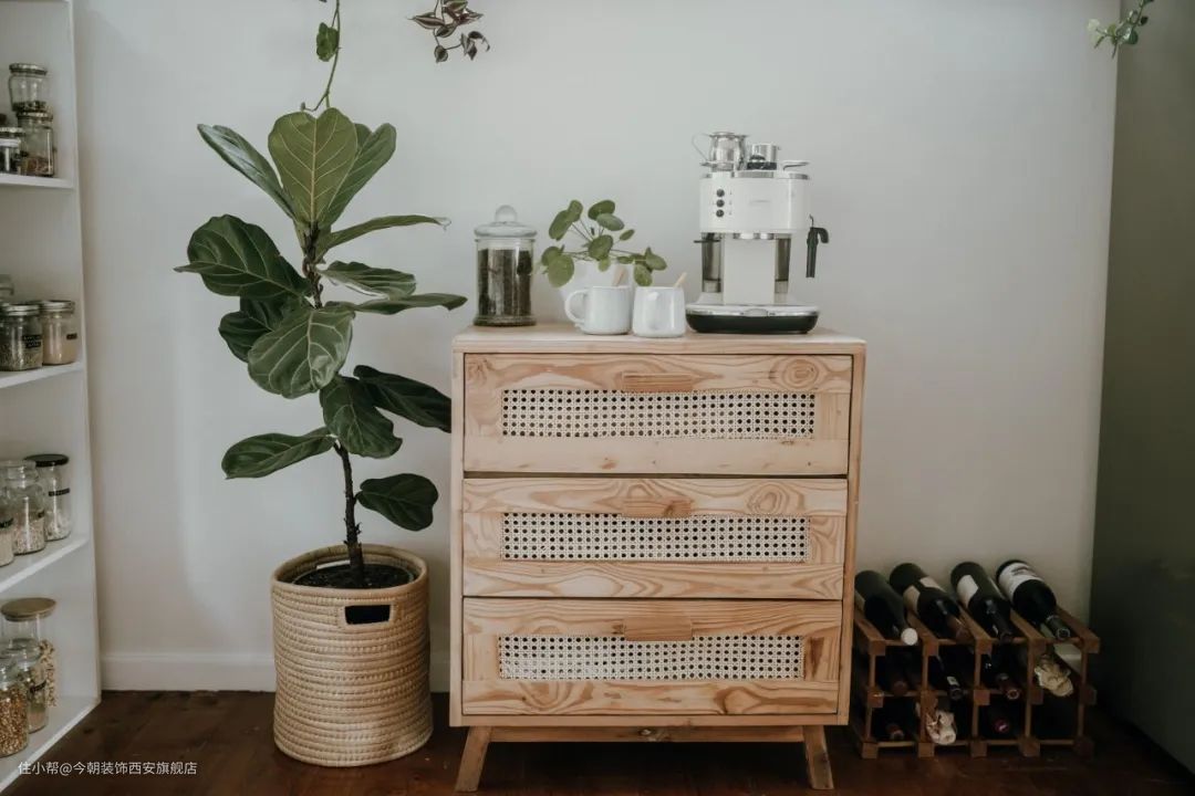 通过设计,可以利用餐边柜的台面区域,打造一个满足水吧区各项功能需求的专属功能区。台面上设有饮水机、咖啡机和保温壶,并配备墙面置物架,方便存放各种水杯和咖啡杯。吊柜或地柜,可以用来存放茶叶、咖啡、奶粉等饮品。