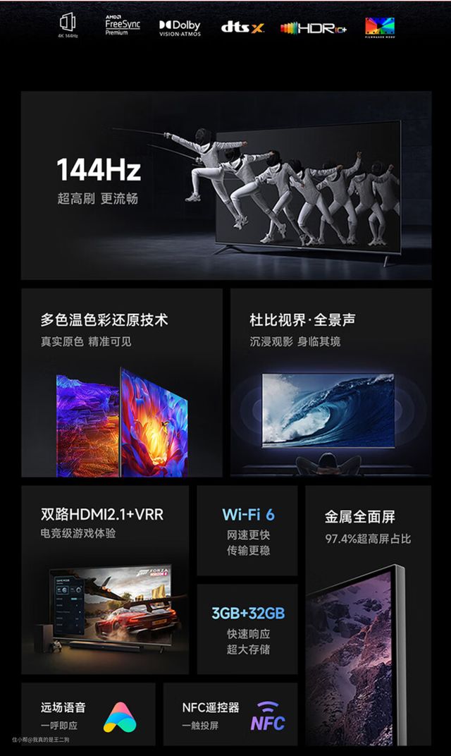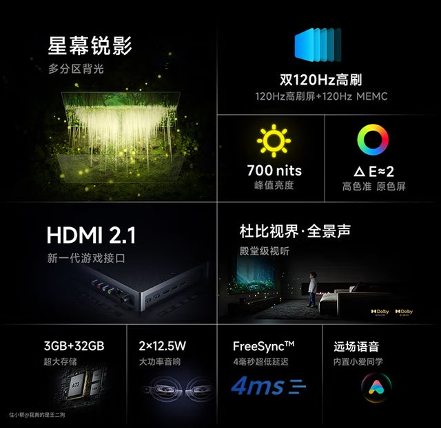 兼顾配置和性价比,可以重点关注下红米X Pro,应该是这么价位目前最值得入手的电视产品(可以说没有之一)。红米X Pro可以轻松主流的游戏和观影需求,尺寸方面包含65和75两个规格可选。四核A73芯片+3G运存、94% DCI-P3广色域、HDMI 2.1接口、700nit峰值亮度、120Hz高刷、MEMC、45个(65寸)/60个(75寸)控光分区、2*12.5W扬声器单元,整体配置还是比较不错的。不过目前尺寸仅有65和75可选,要是尺寸再丰富一些就完美了。