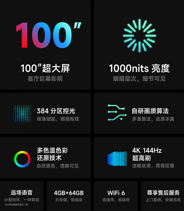 小米S pro系列大火之后,小米趁热打铁接连推出了85和100寸的巨幕型号,依旧是走的高配置低价格的高性价比路线不过100寸的产品对比同系列其他规格的产品,在硬件堆料上有所缩水。峰值亮度1000nit,算是同级产品中比较不错的水准。背光分区数据也还算OK,达到了384个。硬件配置上搭载有A73四核1.4GHz芯片+4G运存,系统流畅性表现还是很不错的。机身支持2组满血HDMI 2.1接口,对游戏玩家较为友好。总的来说配置上没有短板,17999元的价格也很有竞争力,毕竟这可是目前市面上大量量产规格中最大的型号(不考虑非主流的115寸和120寸等型号产品)。很适合兼顾性能配置,同时想要一台性价比高巨幕电视的小伙伴。