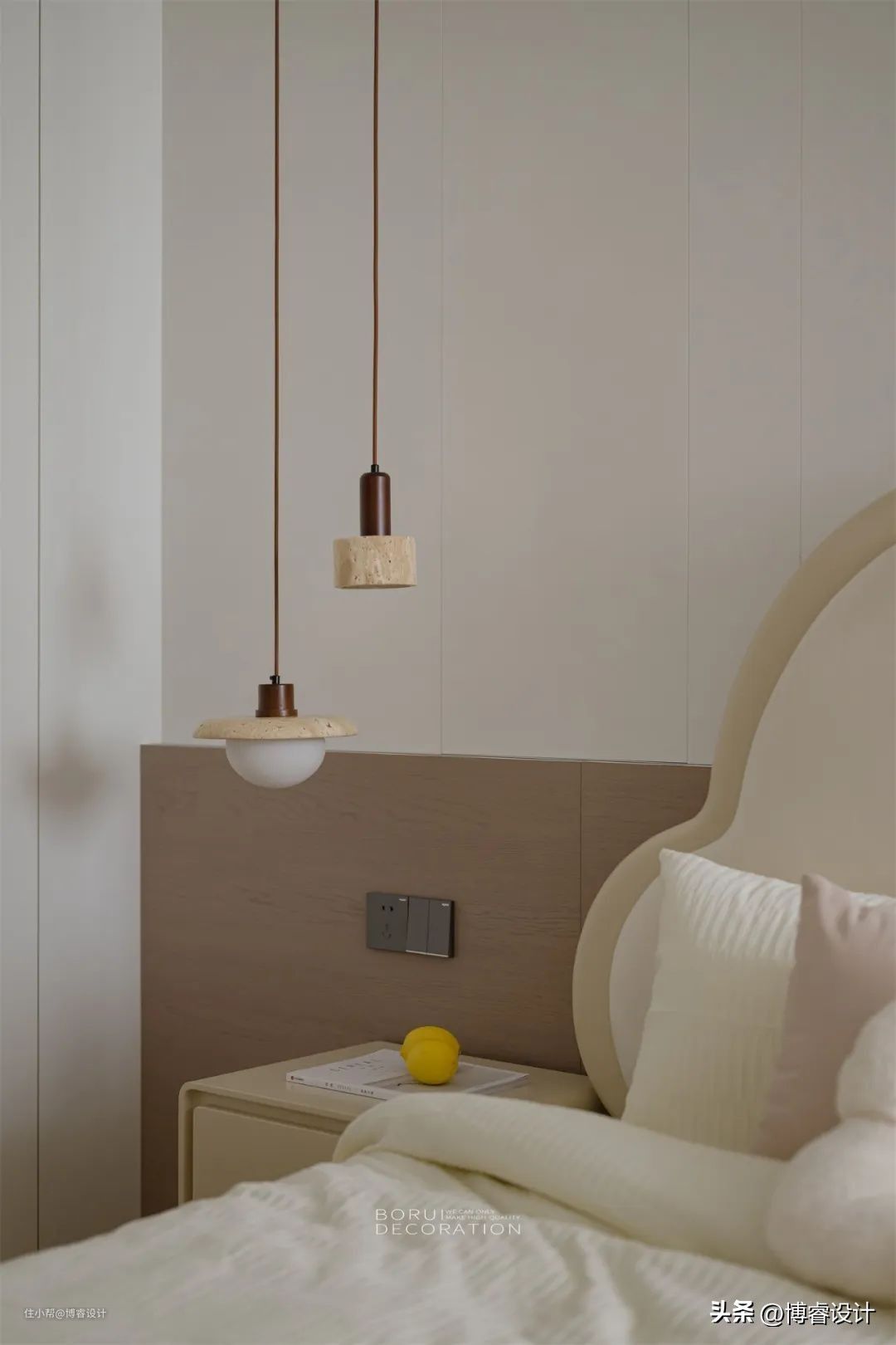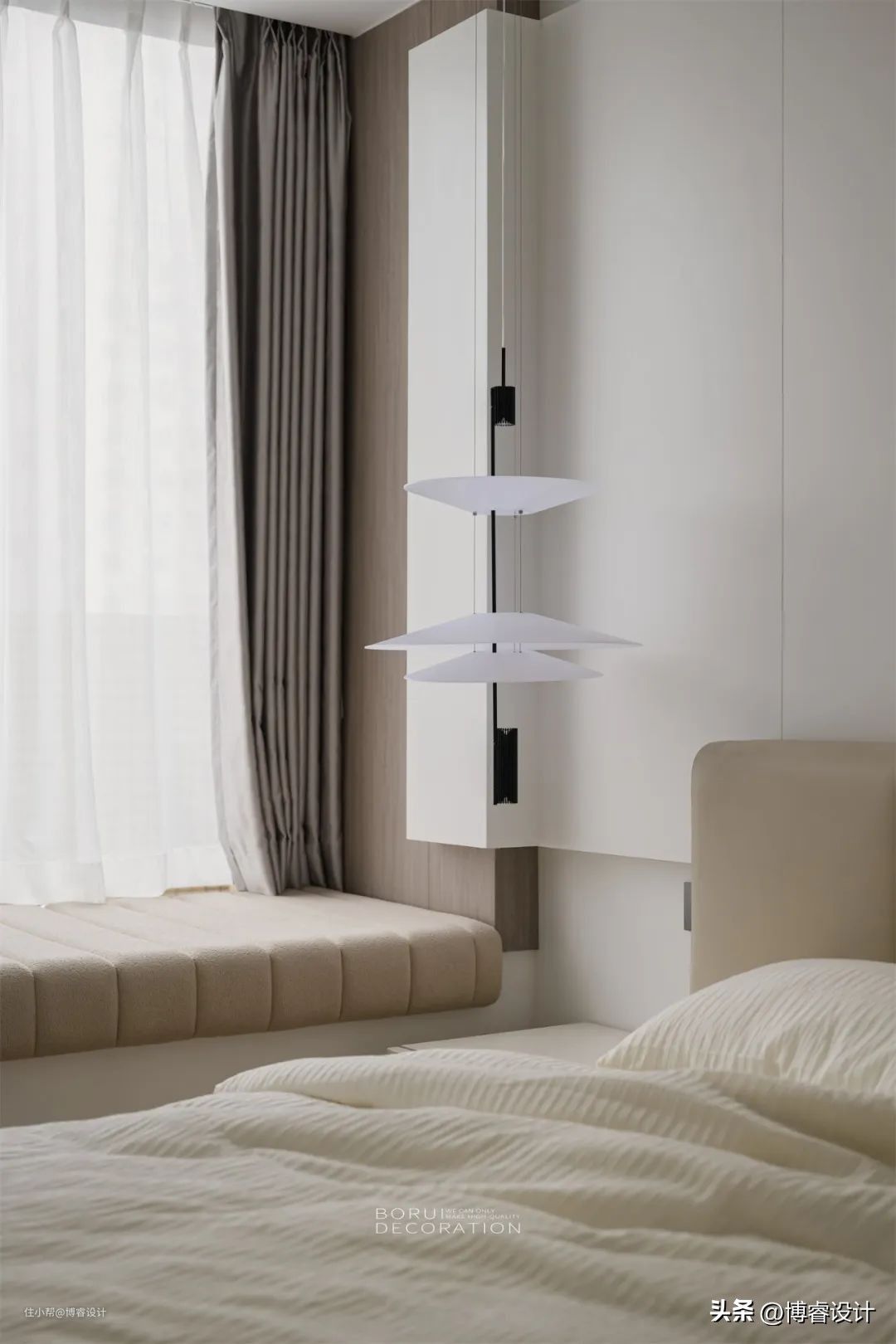 主色调是以浅色为主,创造一个干净、舒适的睡眠环境。简约的复式飞碟吊灯为床区营造了温馨感,悬空床头桌是一个现代且精致的搭配,不仅提供梳妆台的功能,还可以用于放置小物件等,实用系数大大加分。