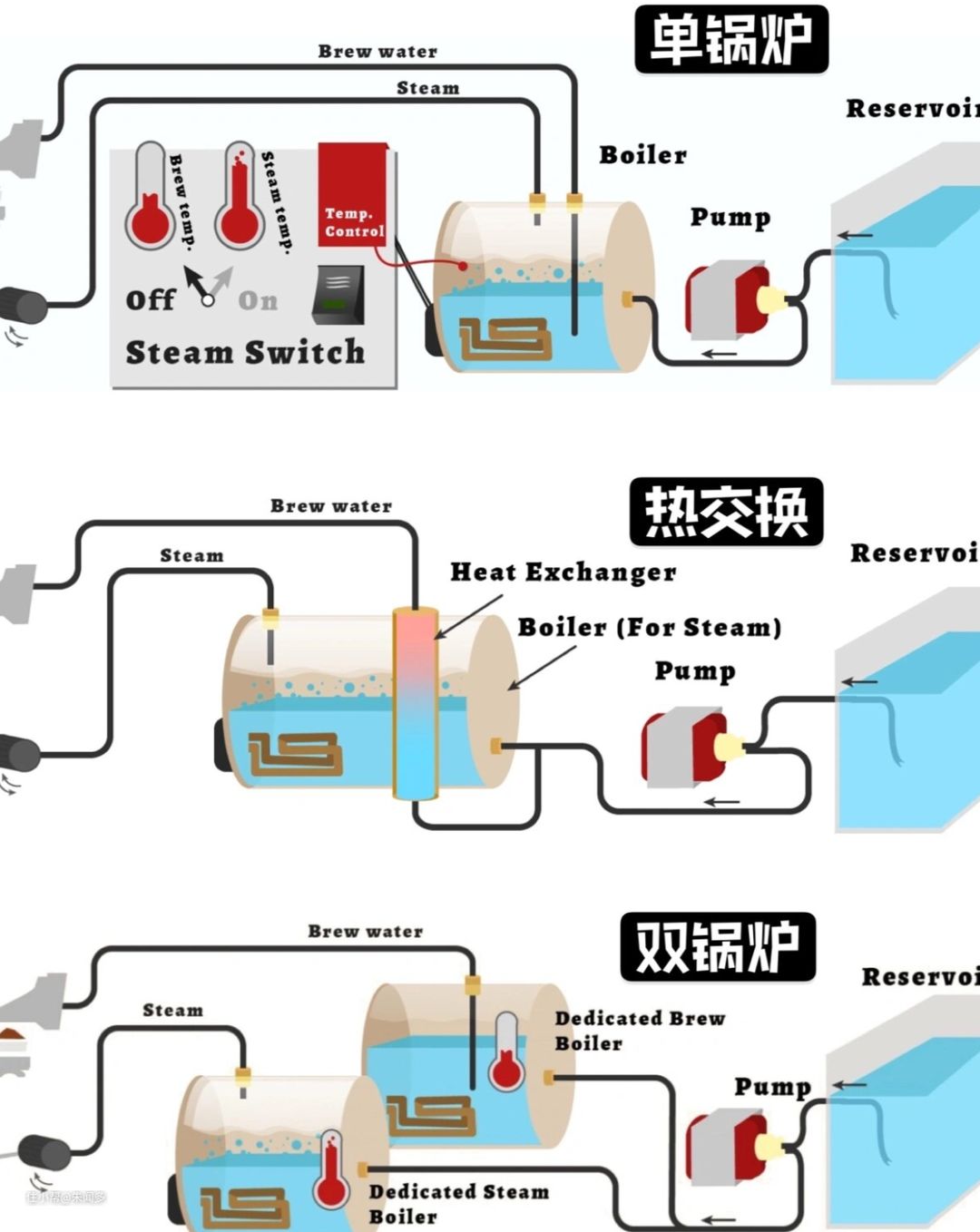 锅炉是用来加热水并将其转化为蒸汽的设备。锅炉式的加热水温稳定、萃取质量高。