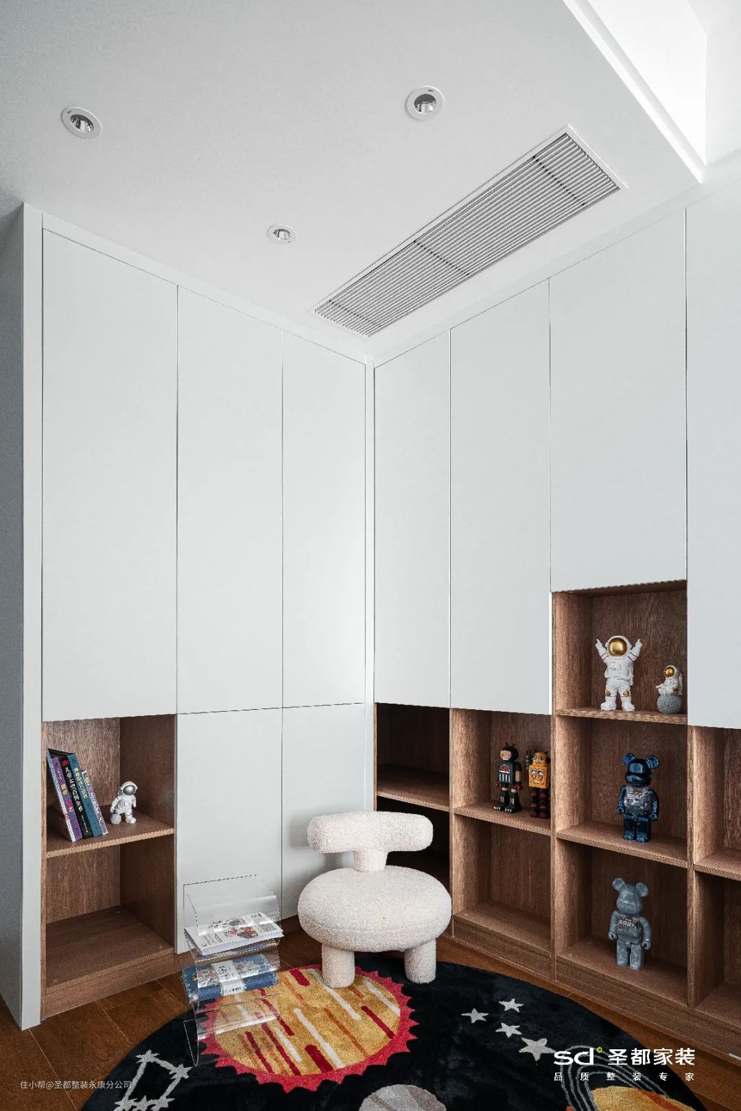 在《可露丽》的案例里,儿童房将暗卫拆除,将这块区域改成收纳空间和玩耍区,拓展了空间的功能。