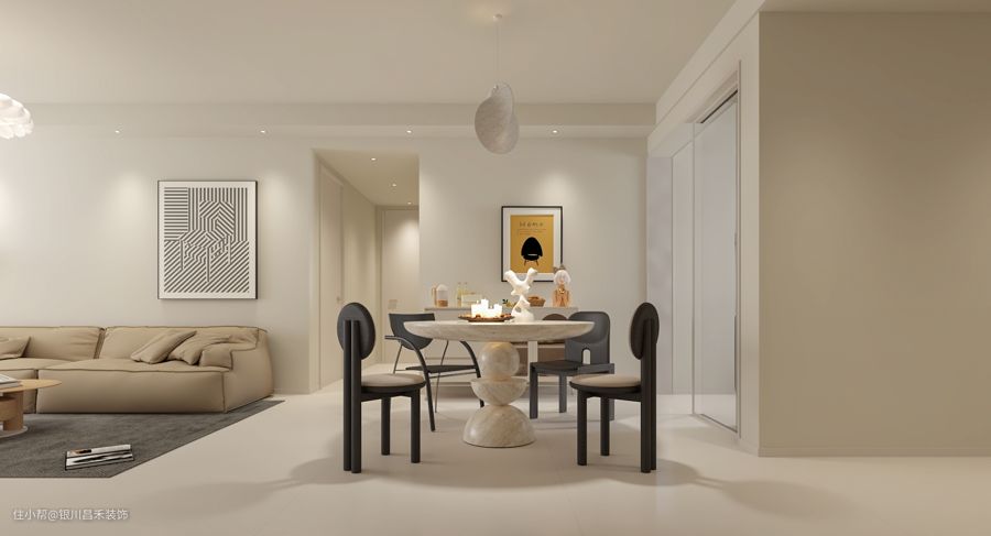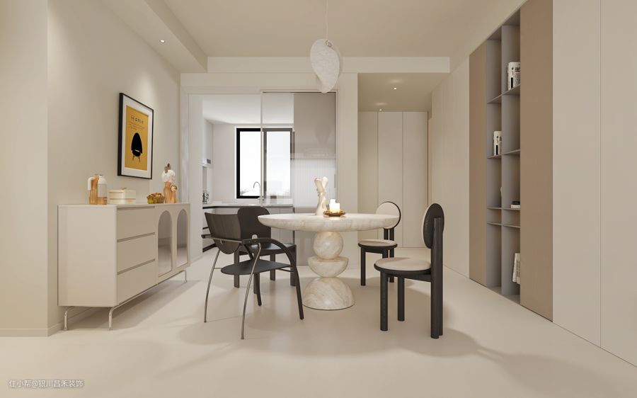 餐厅选择了小巧精致的法式圆桌,奶油白+静谧黑的色彩搭配,奇妙的带来一丝中古气韵。餐桌旁又安排了一个小餐边柜,圆润的弧形线条让优雅不断漫溯。