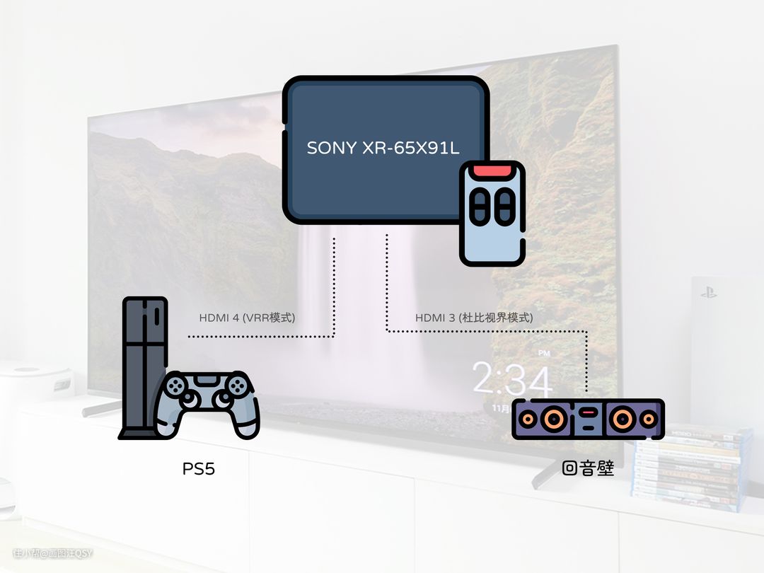 eARC下,PS5主机、索尼XR-65X91L电视、回音壁的接线拓扑图如上所示,希望能够给大家接线一个参考。接入PS5的时候,为保证回音壁能正确点亮杜比音效,要保证索尼XR-65X91L电视的音频输出中,输出设备为回音壁,然后传递模式为自动。