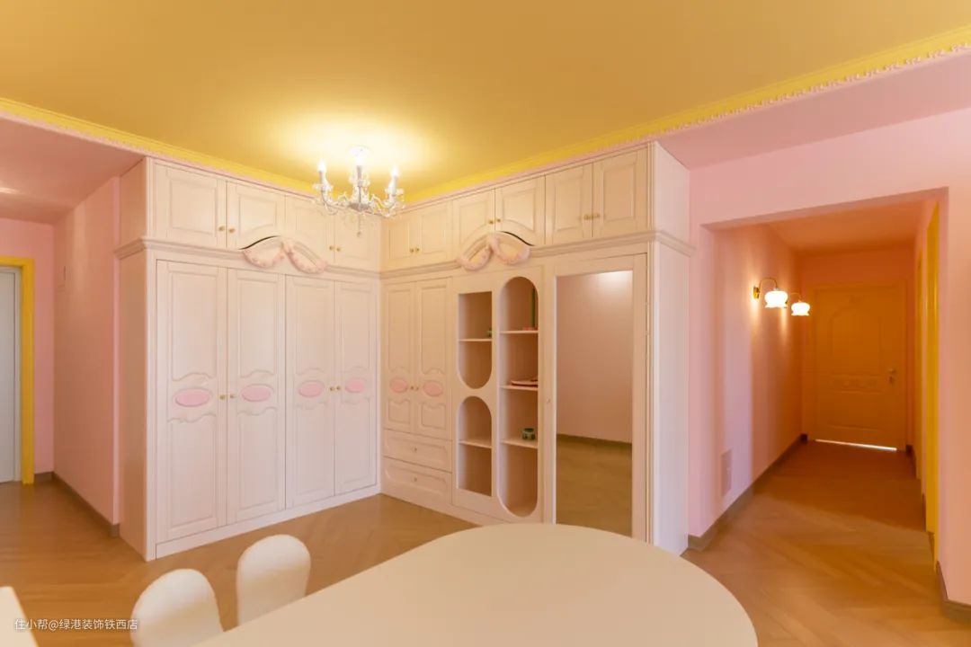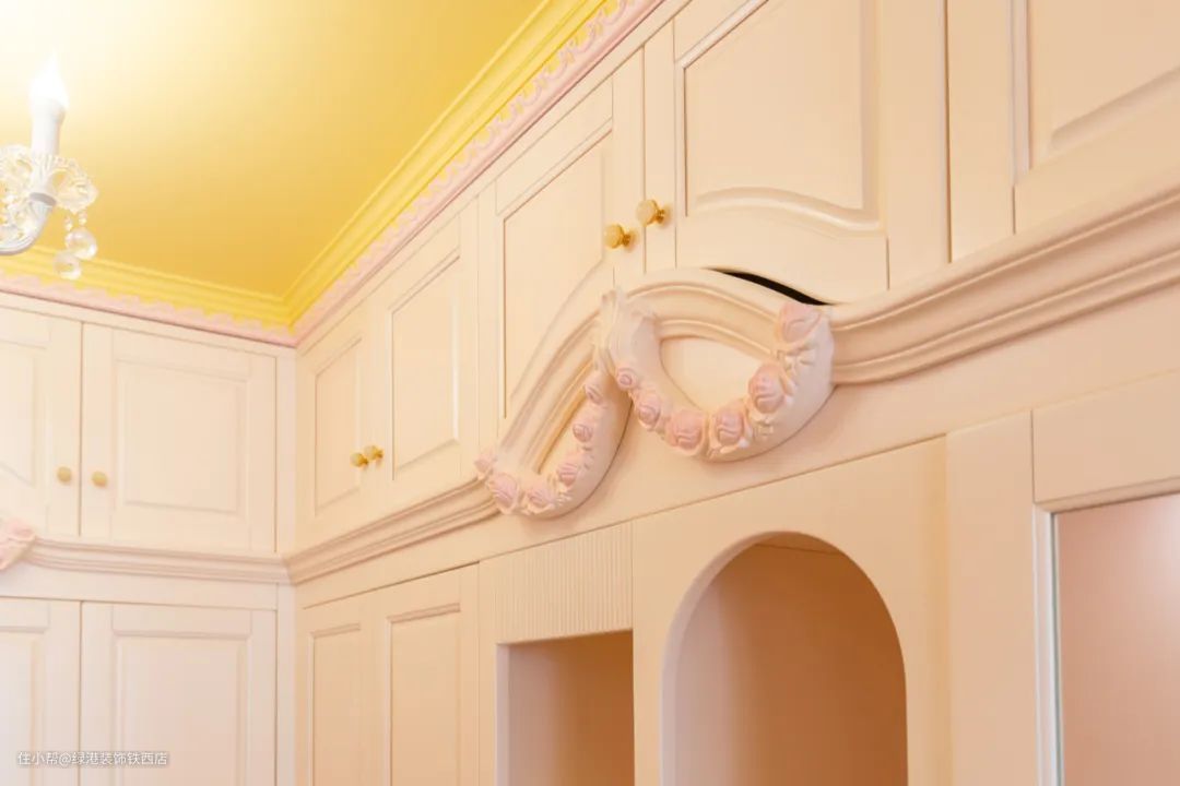 顶面上的蝴蝶结石膏线,也是经过了多次调试和涂刷后,才与定制柜上的粉色元素融为一体。
