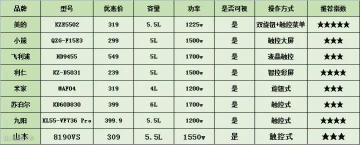 小希这次选了8款比较火的空气炸锅做了横向对比,分别是美的、小熊、飞利浦、利仁、米家、苏泊尔、九阳和山本家的。