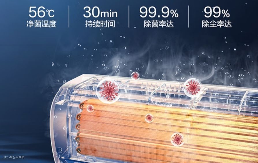 水除菌通过蒸发器结霜化霜,强力冲刷灰尘、污垢、霉菌等进行基础除菌;火除菌通过将蒸发器、风道、风扇等送风系统温度骤升至56℃并维持30分钟以上,相当于在空调内形成一个高温除菌舱,进一步高温除菌;电除菌通过双极离子除菌+UVC深紫外除菌,二者对环境空气中的病菌结构进行破坏,对室内空气主动杀菌消毒。