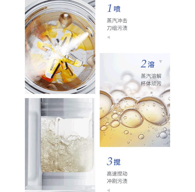 三维高温蒸汽喷洗,除菌率达到99.9%,通过高温蒸汽冲击污渍,再溶解杯体内的污渍、最后再高速搅打后冲刷污渍,真是要多省事就有多省事!